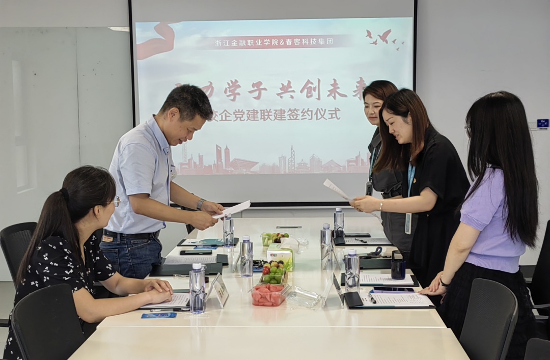 会上,浙江金融职业学院营销电商支部、春客科技集团党支部共同签署《校企党建联建框架协议》。