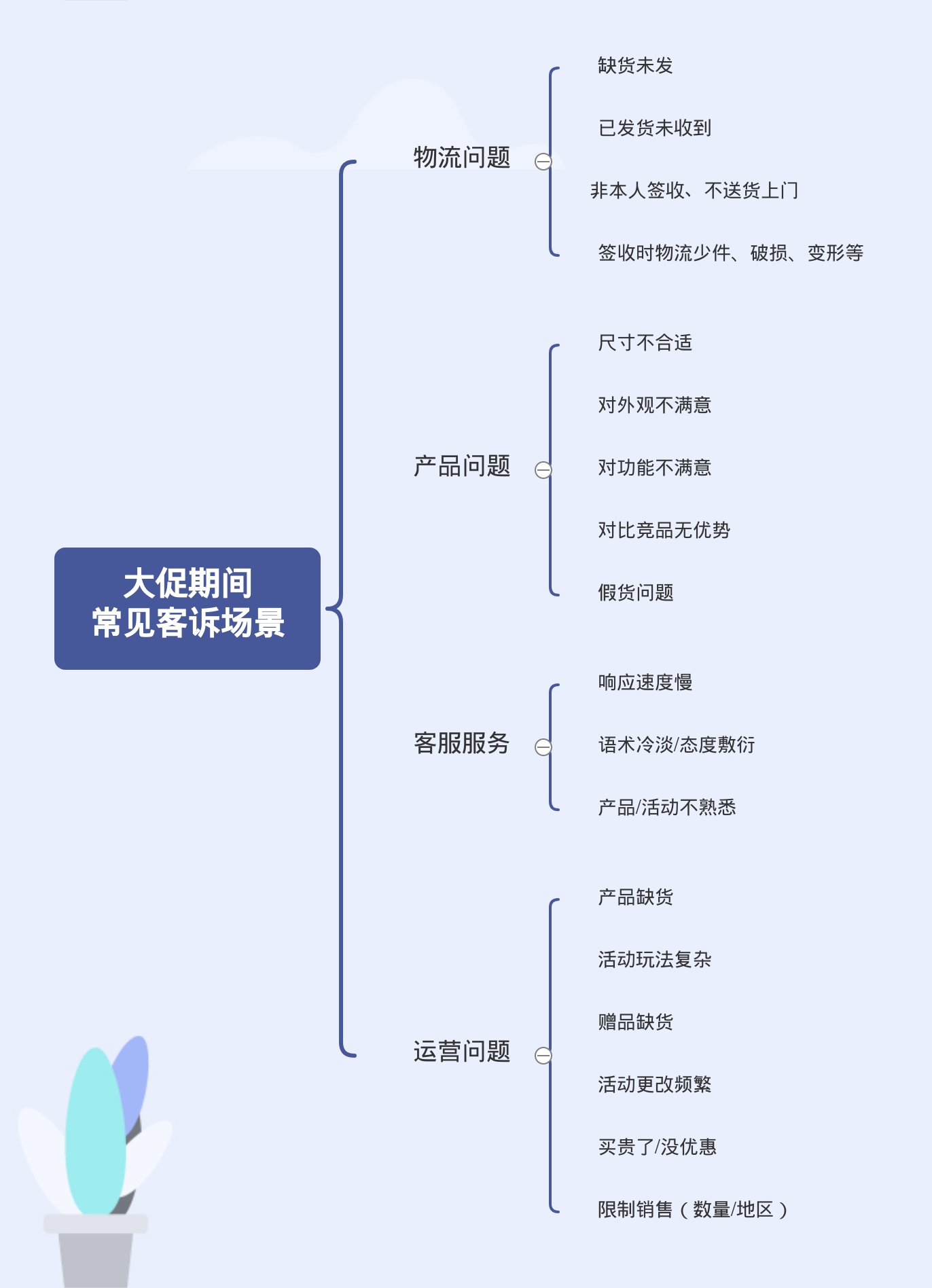 大促期的客户投诉场景,主要可以分为物流、产品、客服服务和运营四大类,基本聚焦在物流及时性、产品承诺的兑现、客服响应/态度以及优惠政策的争议、实时营销活动的把控。