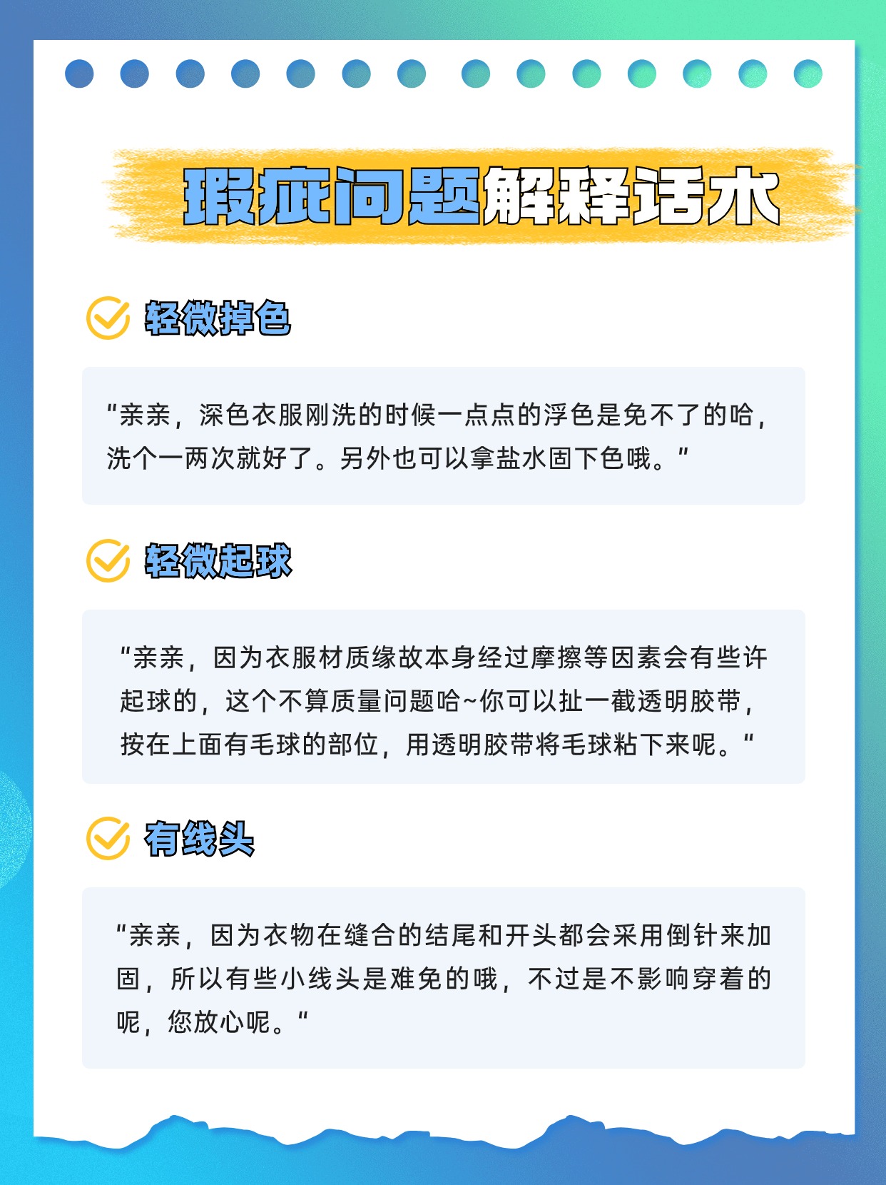 春客解析:对于不影响整体穿着的瑕疵,一旦出现客诉,先道歉安抚买家,对给他们购物体验带来影响深感歉意等,再给他们解释出现瑕疵的原因,说明不影响穿着。这里可以根据常见瑕疵问题整理解释话术: