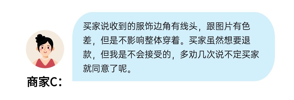 春客解析:其实我们发现不少商家为了节省售后处理时间,会预设一些回复模板,例如建议买家提供图片。考虑到一旦买家要求退货将会花费的精力及成本,商家选择先期通过买家提供的信息在线解决问题也是可行的一种方式。但是仍有几点需要注意: