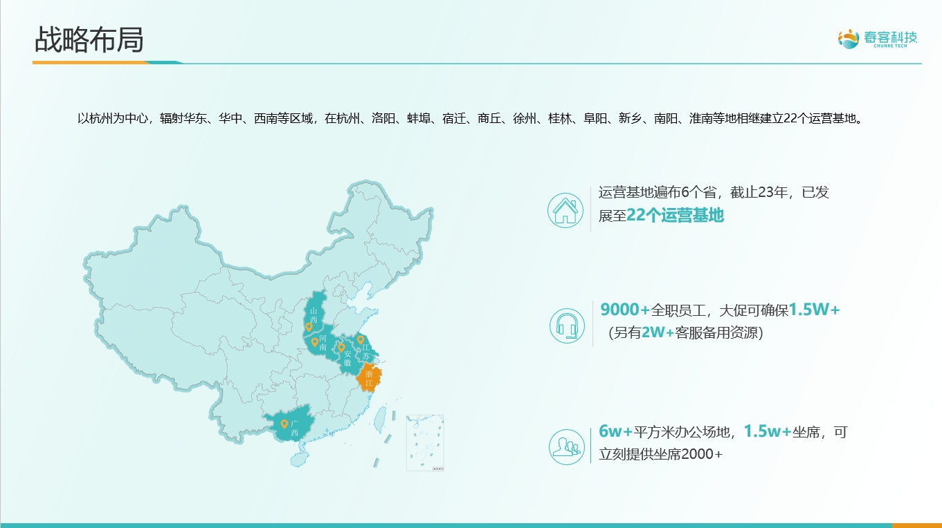 截至2023年,春客科技已自建22个客服基地,拥有9000+全职员工。轻松应对商家的突发需求,避免在销售高峰期出现客服人员不足的情况。
